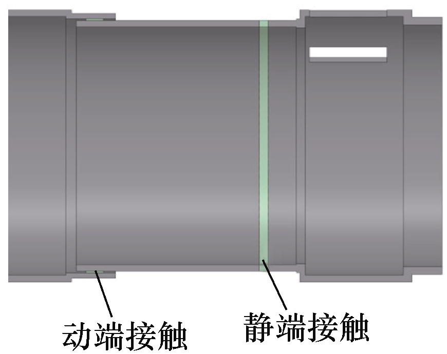 在换相开关通流主回路中存在两处电接触,电接触是导流回路中的主要发热点之一,电接触建模采用等效建模的方式。首先通过对样机实测获得各处接触电阻值,将接触电阻视为串联在触头之间的电阻,对这一电阻进行实体建模并赋以虚拟材料参数,使其电阻值与实测接触电阻一致。通过这一设置,使接触电阻在温升有限元计算中得以体现。电接触示意图如图8所示,换相开关存在两处接触等效,具体接触电阻赋值情况见表1。