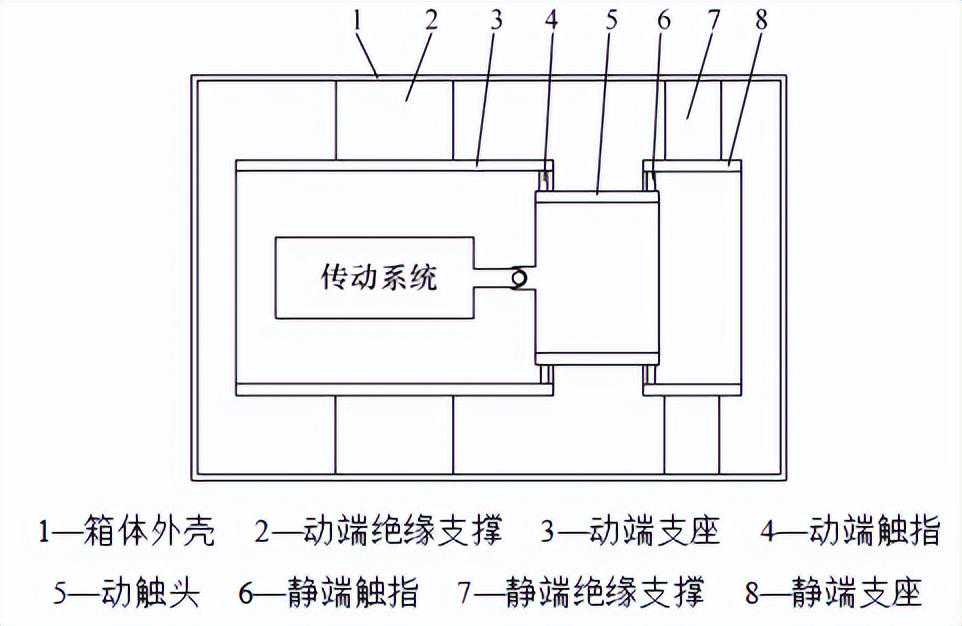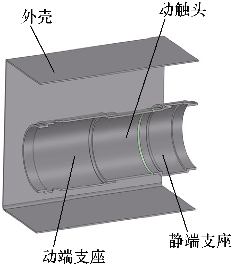 独立型换相开关的单极结构示意图如图6所示,图中所示为合闸状态。在封闭金属箱体内含动端和静端两部分,整体采用水平布置。动端支座、静端支座和动触头均为圆筒状结构,金属箱体与两支座之间使用环氧树脂绝缘件支撑固定,动端、静端及箱体之间的其他绝缘均采用干燥空气。