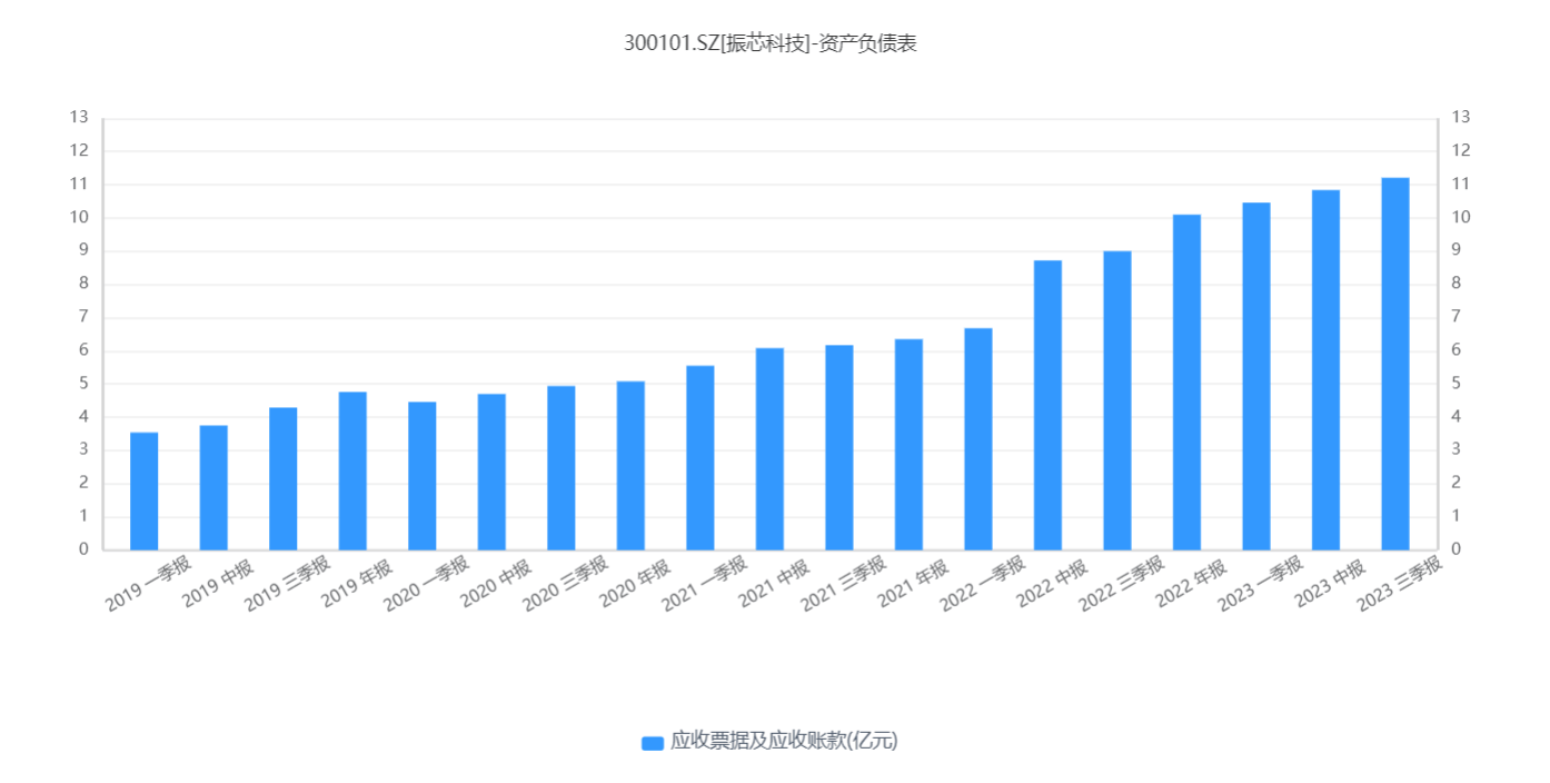 振芯科技应收账款与应收票款的增长是从2021年开始。数据显示2020-2022年末以及2023年三季度末,振芯科技应收账款与应收票款分别为5.08亿、6.35亿、10.10亿以及11.21亿,同比增长6.72%、24.98%、59.11%以及24.55%。