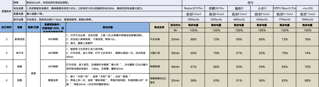 参与测试的机型分别是:搭载了最新骁龙8Gen3处理器,拥有5000mAh电池的RedmiK70Pro;同样是骁龙8Gen3终端,拥有4800mAh的魅族21;以及搭载了骁龙8Gen2,拥有5000mAh电池的荣耀100Pro和4800mAh的小米13;次旗舰部分则是选择了搭载骁龙8+的OPPOReno11Pro,以及搭载了骁龙7Gen3的vivoS18,它们分别拥有4700mAh和5000mAh的电池容量。
