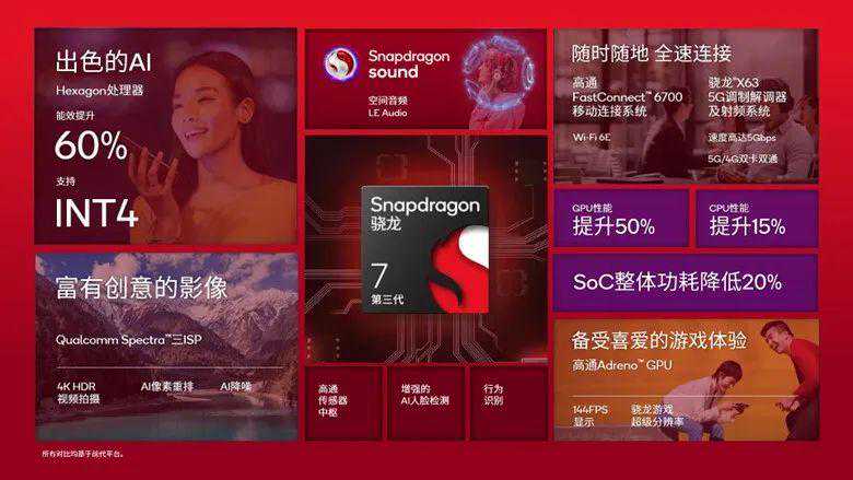 官方称,骁龙7Gen3在CPU和GPU性能提升的同时,SoC整体功耗还降低了20%。
