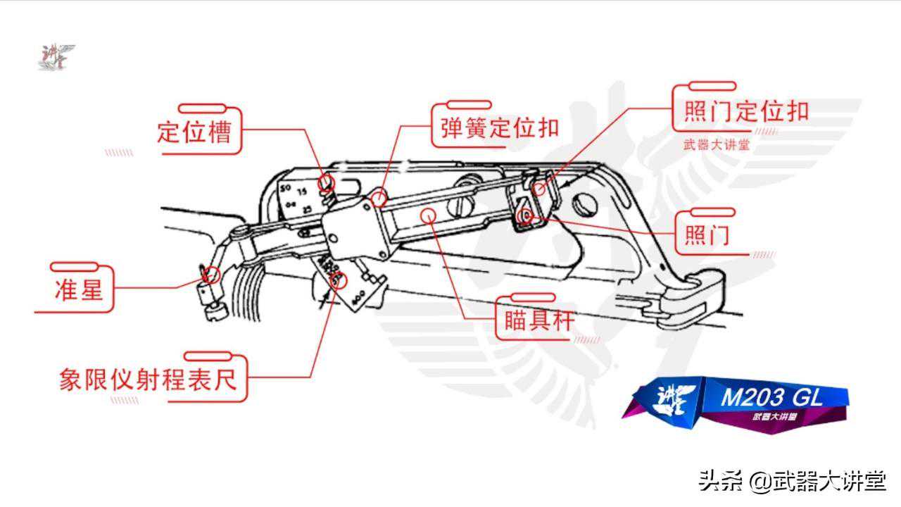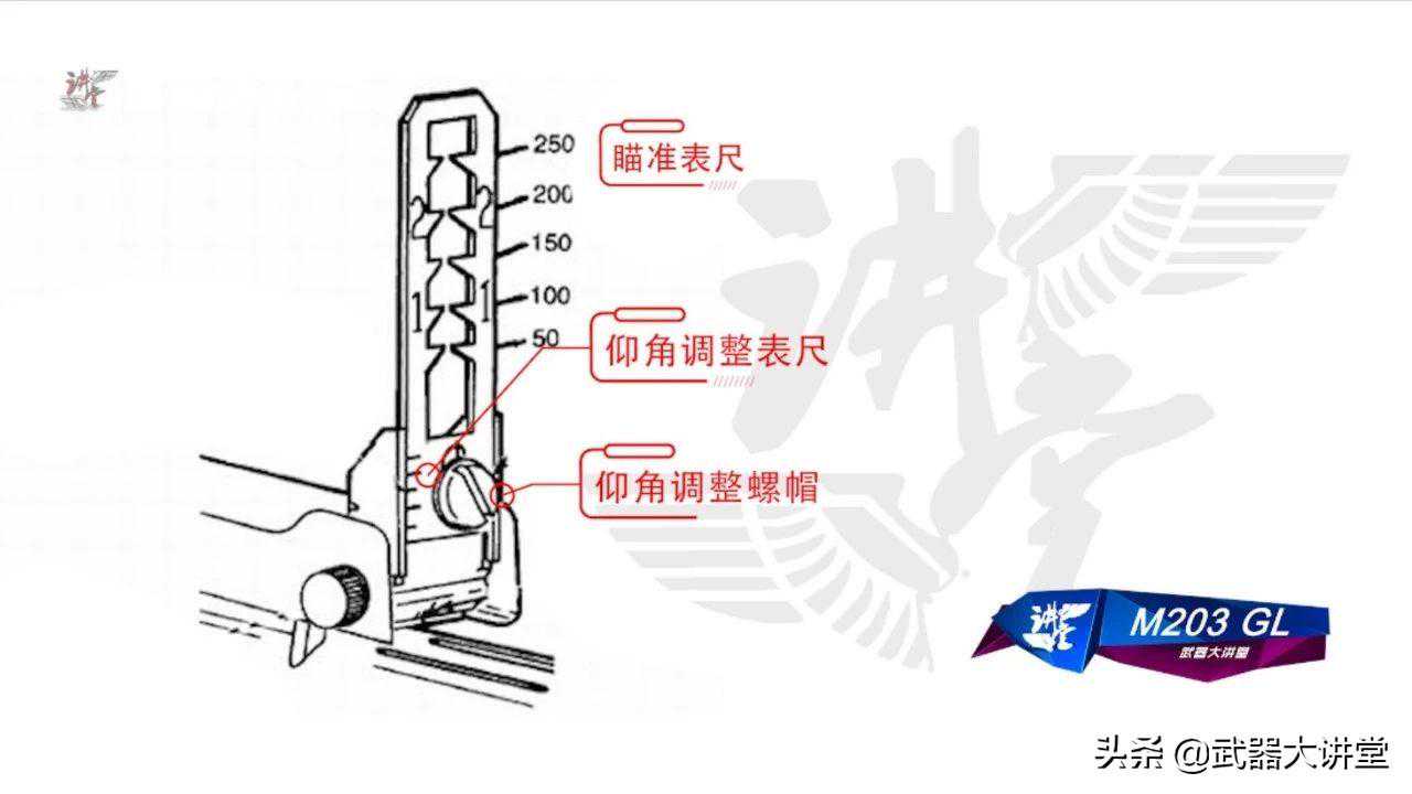 从下往上分别以50米递增对应50~250米的表尺,在下方有仰角调节表尺,通过仰角调整螺帽进行调整,早期的版本并没有风偏调整,所以在越南战场测试的时候M203射速和精度都较低,在后续才做了调整升级。