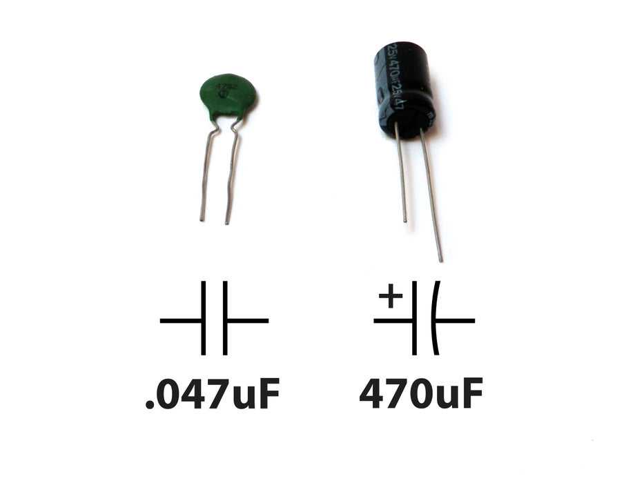 最常见的电容器类型是看起来像微型M&M的陶瓷圆盘电容器,其中伸出了两根电线,而看起来更像是小的圆柱形管的电解电容器,其中有两条电线从底部(或有时在两端)伸出。