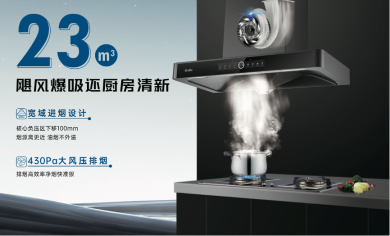 当烟机开启爆炒模式时,风量可达23m³,强力飓风爆吸使厨房空气可以时刻保持清新。此外,烟机采用了宽域进烟设计,将核心负压区下移100mm,从源头实时抽走油烟,有效防止了油烟的扩散与逃逸。配合420Pa大风压和360加速器,抽烟提速,立体增压,排烟效率更是强悍,常态气味降低度超过97%。