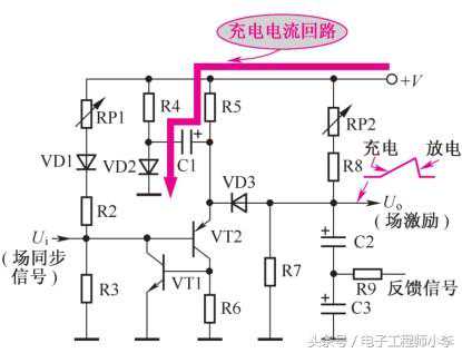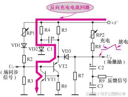 场同步过程输入信号Ui是场同步信号,这是一个负极性电压,它加到VT2基极。在VT2处于截止状态时,场同步信号电压加到VT2基极,强迫VT2从截止状态提前进入饱和导通状态,实现场同步。
