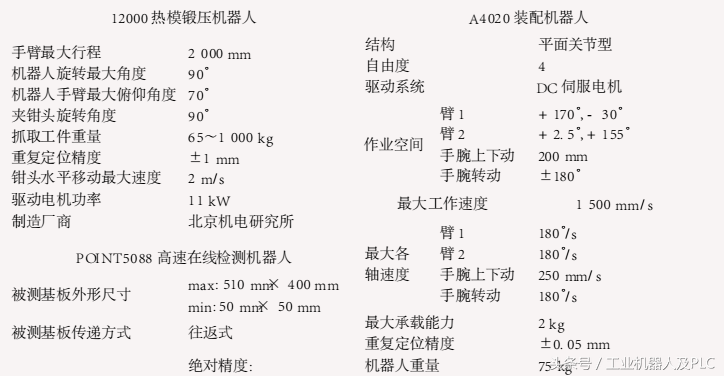 二、工业机器人技术参数技术参数是各工业机器人制造商在产品供货时所提供的技术数据,表1-1提供的几种工业机器人的主要技术参数是从国内外工业机器人产品样本中摘录出来的,仅供参考。尽管各厂商所提供的技术参数项目是不完全一样的,工业机器人的结构、用途等有所不同,且用户的要求也不同,但是,工业机器人的主要技术参数一般都应有:自由度、重复定位精度、工作范围、最大工作速度、承载能力等。