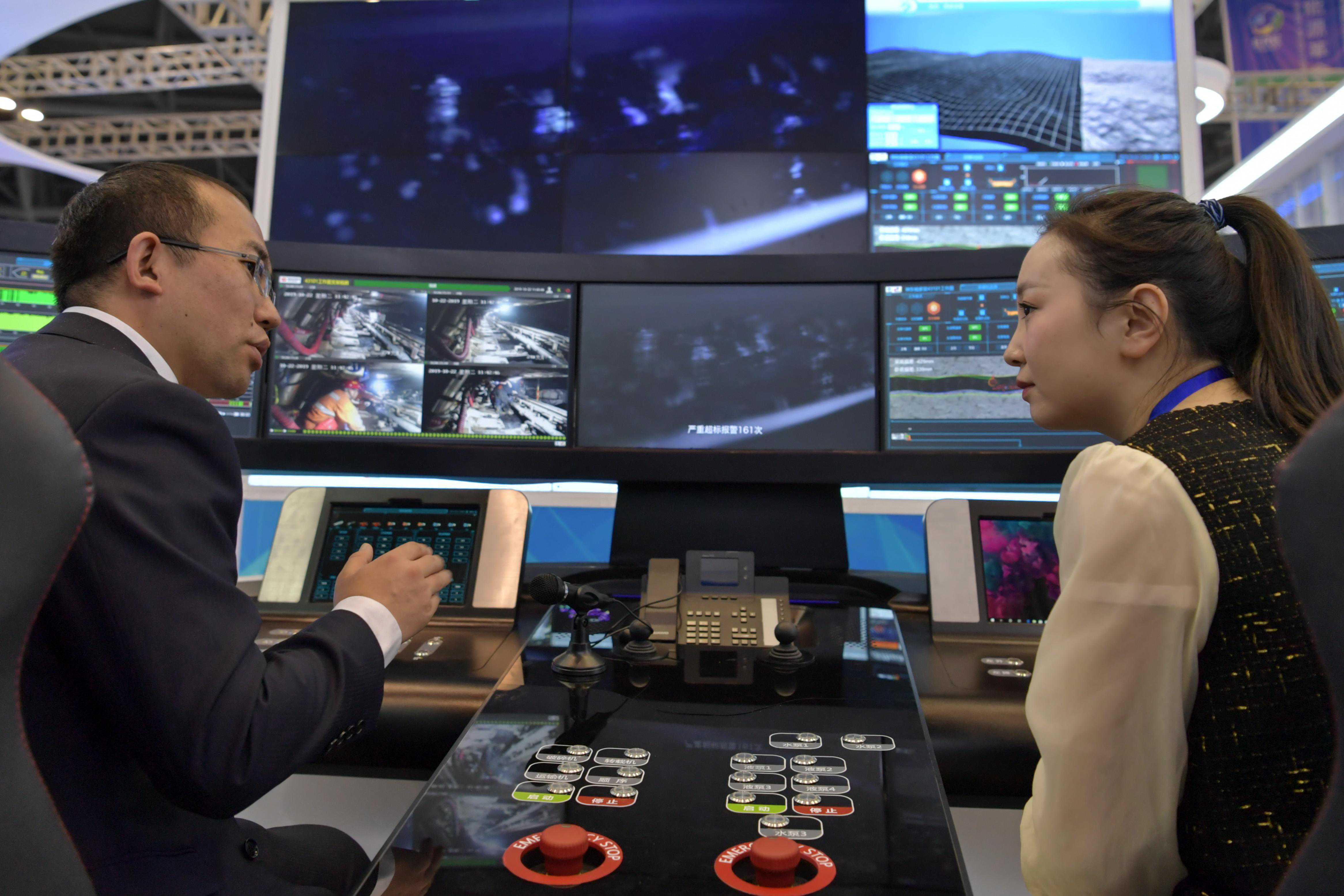 展会现场,国家能源集团工作人员坐在远程调度指挥操控平台前,就能够实时操控400公里外的井下工作面。