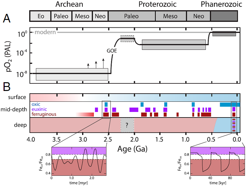 现代海洋普遍是含氧的,缺氧仅限海洋的氧最小带(OMZ)和少数黑海那样的局限盆地。而前寒武纪和显生宙早期海洋内部普遍被认为是缺氧2(图1)。重建白垩纪之前深海的氧化还原演化是一个挑战,因为缺乏公认的深海环境沉积岩记录。不过一定深度之下古海水的氧化还原重建还是能够实现,现有的研究3,4表明前寒武纪和显生宙早期的海盆时空交替地处于富铁(铁化的)和富硫化物(硫化的)环境下(图1b)。最近的证据还表明在显著氧化的中生代的“大洋缺氧事件”期间也出现周期性盆地规模的富铁和硫化的环境转变(图1B)。两种截然不同的氧化还原状态意味着十分不同的化学环境,控制着生命限定元素(如P、Fe和Mo)的含量,对海洋生产力、生物和演化等具有重大影响。