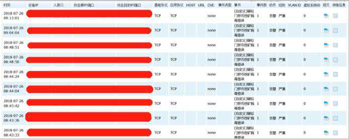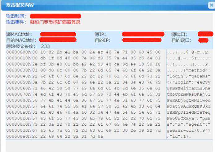 再次查看安全防护设备的挖矿病毒的攻击记录,从挖矿记录的报文看,发现了钱包地址等信息,报文信息如下: