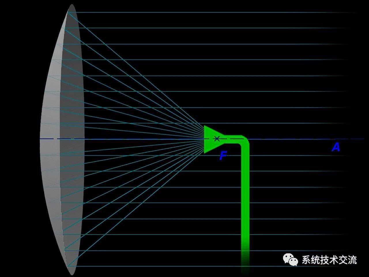 根据光学定律和分析几何学,对于这种类型的反射器全部反射光线将平行于抛物面的轴线,这给我们理想情况下只有一个反射射线平行于主轴,没有旁瓣。田地离开这个饲料喇叭时有一个球形波。当波前的每个部分到达反射表面时,它会移动180度同相并向外发送的角度使场的所有部分平行行进路径。