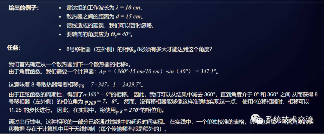 如果要传输的信号现在通过相位调节模块路由,辐射方向可以通过电子方式控制。但是,这不可能无限期地实现,因为这种天线布置在垂直于天线场的主要方向上的有效性最大,虽然主方向的极端倾斜会增加不需要的旁瓣的数量和大小,同时减小有效天线面积。正弦定理可用于计算必要的相移。