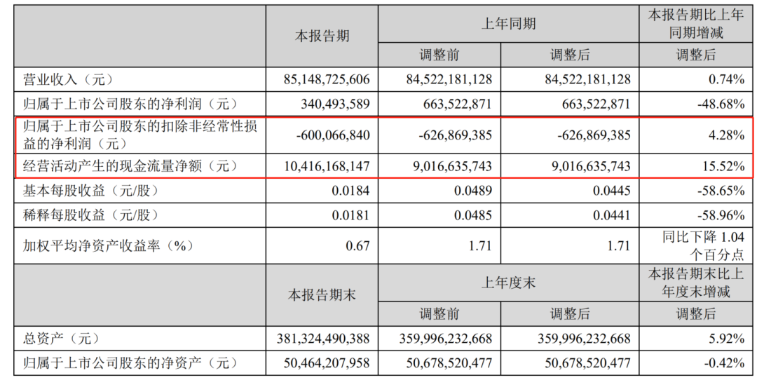 二季度单季度实现营收457.24亿元,同比增长4.01%,环比增长15.86%;归母净利润8.89亿元,同环比均扭亏;扣非后归母净利润1.3亿元,同环比均扭亏。