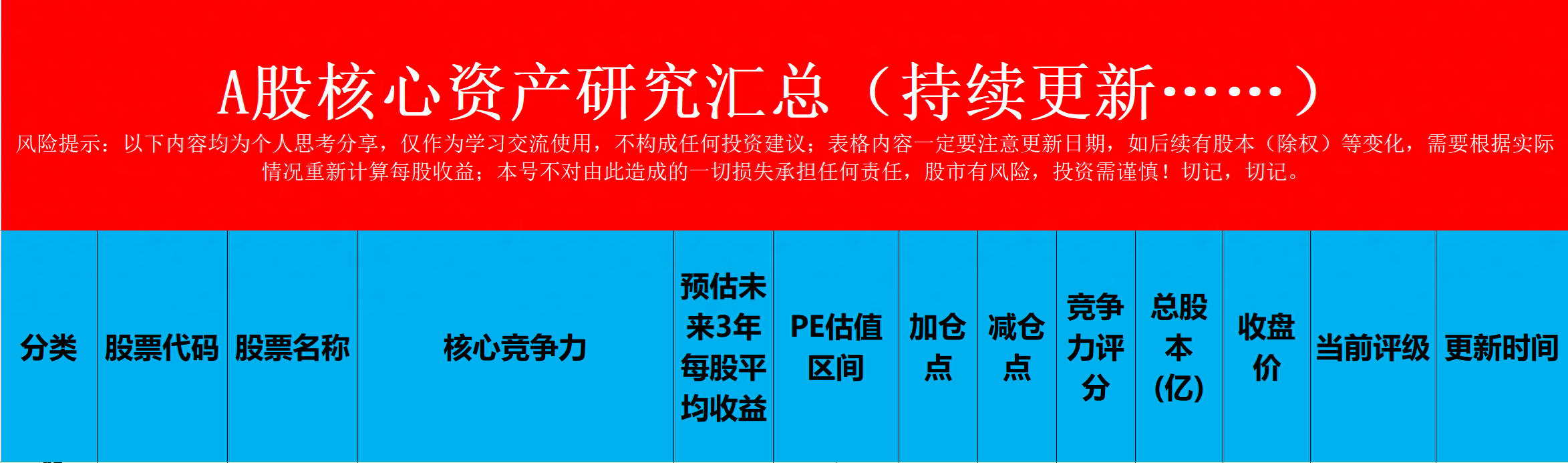 我做了下面这张《A股核心资产研究汇总》表,里面精选了上百家优质的龙头公司,并附数万字的分析方法。