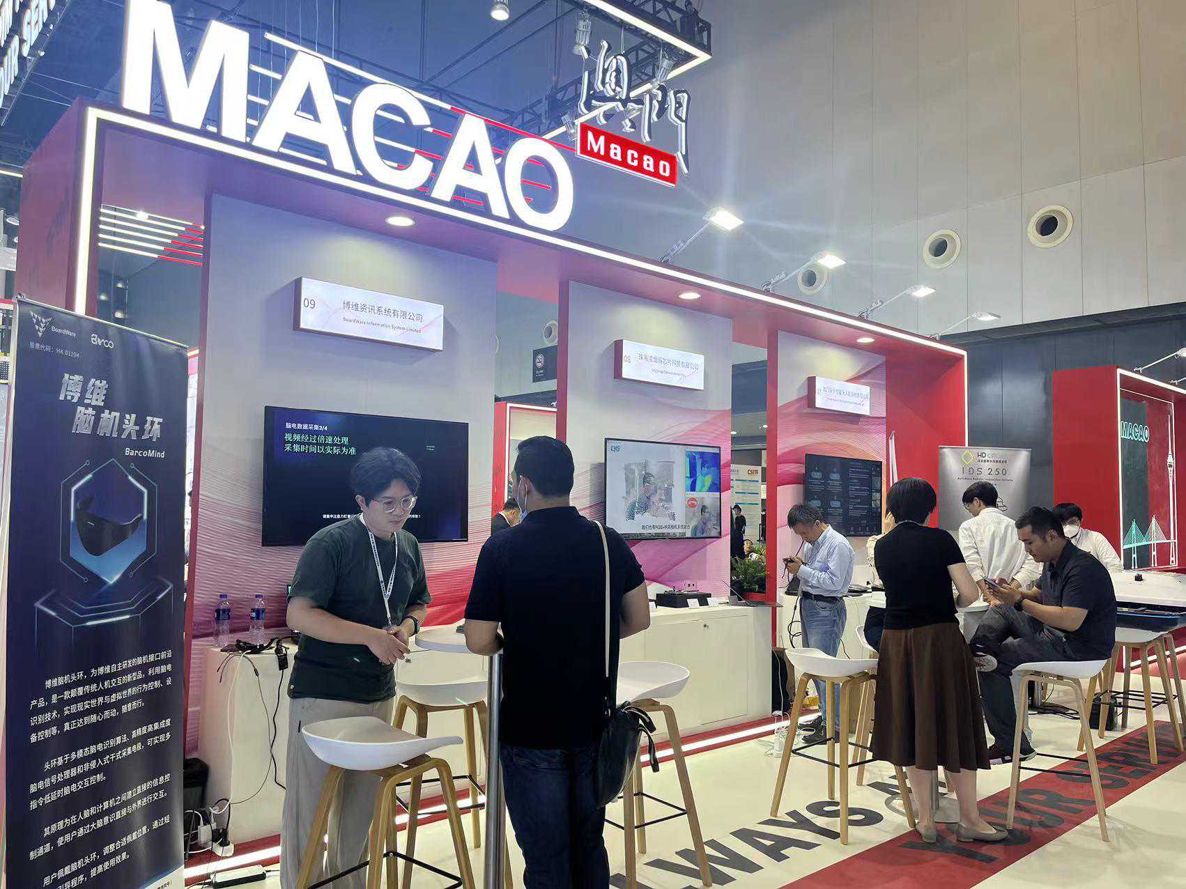 上交会现场专设了约200平方米的澳门主题馆,主题为“科创生态构建”。智慧城市数字化解决方案、企业智能型网络服务领域、全自动仓库盘点无人机系统、结合脑机头环开发出的多传感器融合模块……近20家澳门高科技企业的参展产品充分展现了澳门在医疗健康、智慧城市、智能网联领域的科技成果。澳门主题馆现场还设置了“会展竞投及支援一站式”及“投资者一站式”视像咨询服务。