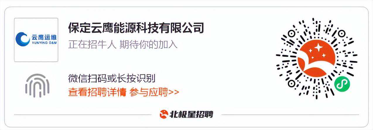 简介今天为大家分享保定云鹰能源科技有限公司的招聘信息,是光伏领军企业英利集团的全资子公司,中国领先的光伏电站运维服务提供商。热招光伏电站运维值长、站长、运维工程师、运行管理部经理等岗位,多地区招聘!具体岗位见下图~岗位薪资地区人数光伏电站运维值长(河北区域)7千-1万河北保定15人光伏电站运维站长(河北...