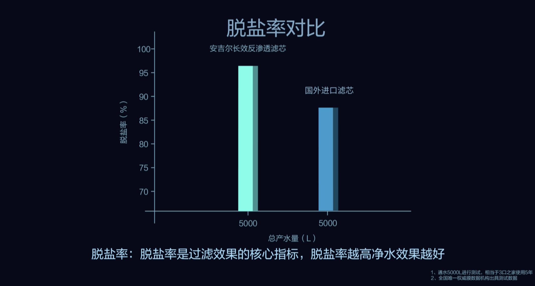根据天津海水淡化研究所提供的测试结果,通水1000L(相当于3口之家使用一年)后,进口滤芯脱盐率会衰减14%,而长效反渗透滤芯的脱盐率长期稳定在94%以上,几乎无衰减。