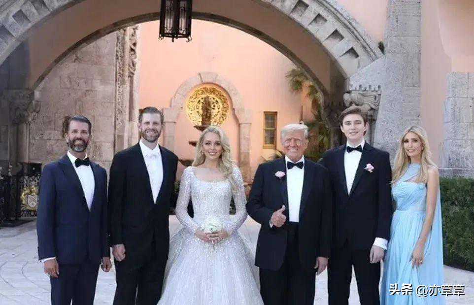 你看,在2022年底川普的次女蒂芙尼婚礼现场的大合照里,巴伦的站位比伊万卡更靠中间。