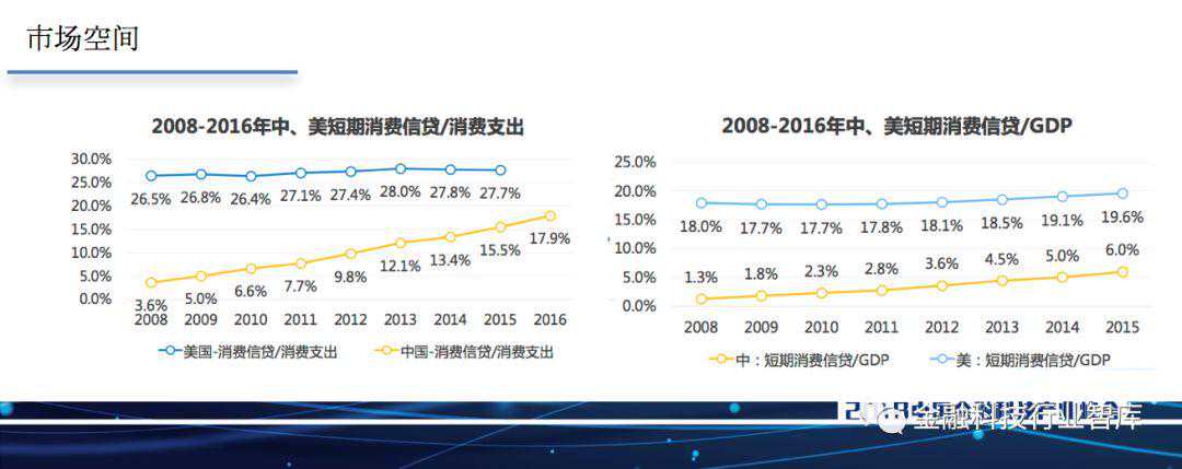 后面一些数据给大家分享一下,这是我从公开数据看到的,我们和美国做比较,美国是世界经济第一大国,当然也是发达国家,从消费金融对我们中国来讲有一定的参考价值。美国从2008-2016年的对比,短期消费信贷和消费支出比例比我们高很多我们是17.9%,美国27.7%。第二个,从消费信贷占GDP的比重,我们只有6%点几到7%,GDP占比重只有这么多,美国占20%左右,常年这个水平缓慢增长。说明我们从市场空间总量来讲,空间很大。我们GDP的增速还是人口的基数,消费群体整个的人数,都是比美国大的,所以咱们的市场空间非常大。