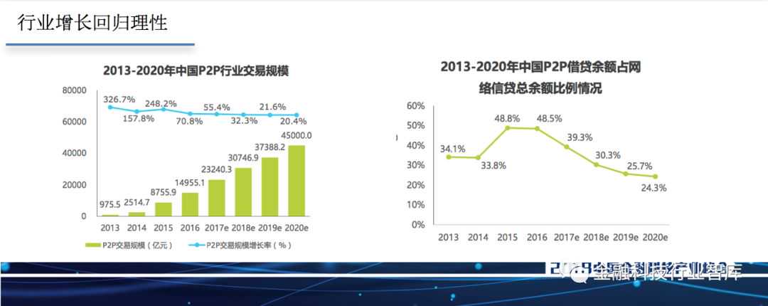市场空间非常之大,市场增速也非常快,但是这些年咱们能看到,我们的行业交易规模,这是从P2P网贷来看,我们的行业交易规模每年的增速比较快,但是咱们从2013年-2015年的增速都是超过100%的,每年都会翻番,甚至翻几番。从2016年开始,增速下来了,这个时候有风险了,因为毕竟这是一个风险业务,做信贷本身是一个风险业务。另外我们加强监管,有一些机构,不论是自己的合规问题还是经营能力问题,也出现了很多问题,但是整个的增速依然在20%以上,是很多行业都达不到的,增速还是非常之快,只是说更理性了,不像前些年几千家、上万家的机构在做。借贷余额占比有所下降,P2P网贷上,但是整体的增速还是比较快。