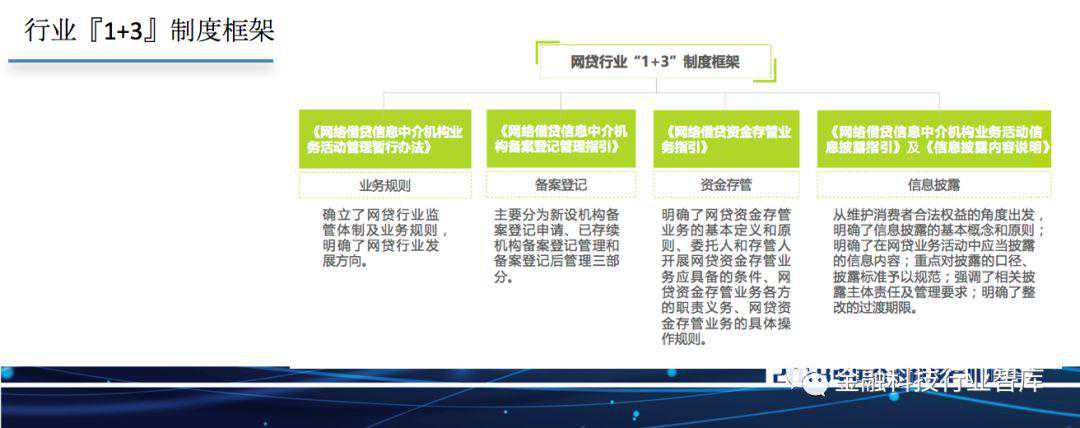 最终我们也形成了对于网贷行业来讲这么一个监管的框架,“1+3”的制度框架,一个是业务规则,《网络借贷信息中介机构业务活动管理暂行办法》,再一个是备案登记、资金存管和信息披露这几个方面,规定了机构哪些不能做,哪些必须做,监管制度规范已经日趋明确了。但这里也遇到很多问题,因为行业的一个特点决定了,咱们发现为什么我们整个监管整个备案又延长了一年,实际上由我们的行业特点决定的,一是行业发展快,模式也好,另外一个特点是金融科技或者叫互联网金融,它是建立在数据、建立在互联网、建立在算法这些基础之上的。简单的可能我们出了这些政策,到底怎么约束规范这些行为,可能还有一段距离。这就是前面咱们看到的这些规范。