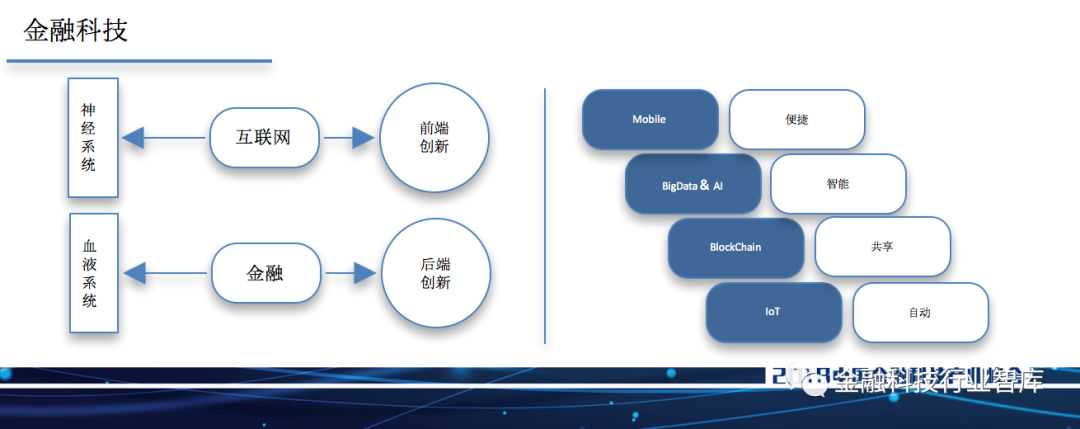 互联网金融的一个本质,从字面理解就是互联网+金融,但是它不是简单的加。我们知道互联网可以类比为是实体经济的神经系统,它是一个信息沟通的网络,它更多的是一个前端创新,接触客户,客户和机构和你的产品服务能够通过网络很快的获取,所以互联网咱们能看到很多的不论是通信的、游戏的还是电商的,它更多的是解决了一个前端创新、便捷性,本身的业务模式并没有本质的变化。对金融来讲,金融是一个资源的跨期配置,是价值的跨期配置,在这上面它是我们实体经济的血液系统,血液系统意味着更多是后端创新,对于我们金融的消费者来讲,你能获得那些金融的形态基本上是固定的,当然还有很多,对于咱们来讲,不论你是融资端还是投资端,基本上后面产品的交易模式对于咱们交易结构,对于我们金融消费者是透明的。但是互联网+金融,两个创新皆有,不再是你要到柜台办业务,在线就做了,解决了便捷性,就是移动互联,这是很大的一个创新,这是技术驱动的。第二个是大数据和AI,智能性。还有BlockChain价值共享,不可篡改。还有万物互联,解决了价值的自动转移或者数据的自动收集。所有的这些基础技术融合驱动,我们有这么一个产业,有个产业的发展,这个产业它不再是一个简单的。我有门店,我去看你的作业规不规范,这完全是建立在代码基础之上的。这些的发展就是要研究我们这些规范以及行业发展的需求,政府的需求、客户的需求、机构的需求,把它都形成技术规范、技术标准,最终能够目前实施,而不是花很大的力气找人再来做这个事情。