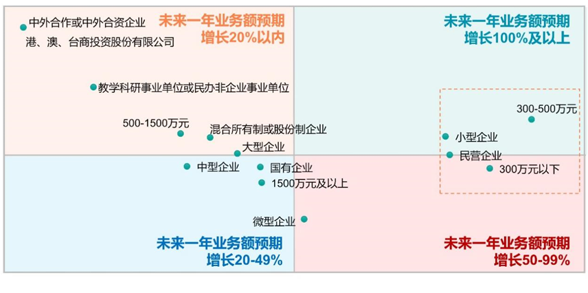数据结果显示,小微企业和民营企业预期业务额增长的幅度相对更高。具体来看,业务额预计增长100%及以上的主要为年业务额300-500万元的小型民营企业受访者;业务额预计增长20-49%的主要为中型企业(年员工数量100-299人的企业)、国有企业,以及年业务额在1500万元及以上的受访企业;业务额预计增长20%以下的主要是大型企业,以及合资/境外投资/事业单位等。