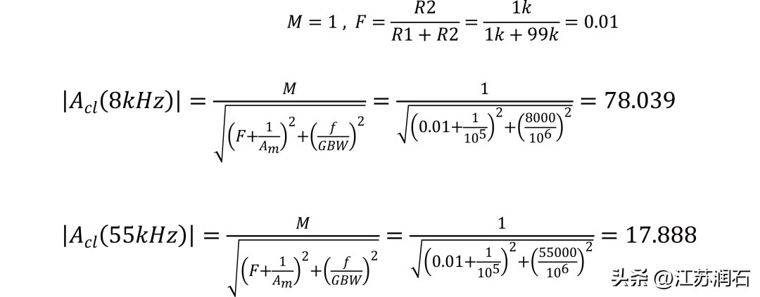 根据Figure2,R1=99k,R2=1k,运放GBW=1MHz,Am=100k,计算f=8kHz和f=55kHz下,电路的实际闭环增益Acl。