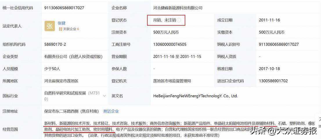 企查查显示,河北健峰新能源科技有限公司成立于2011年,注册资本为500万元,其中金浩认缴出资额275万元,占比55%。公司主要经营太阳能产品组件,包括背板、单多晶电池片、单多晶硅片、EVA、胶带等。该企业已于2021年11月被吊销(见图三)。