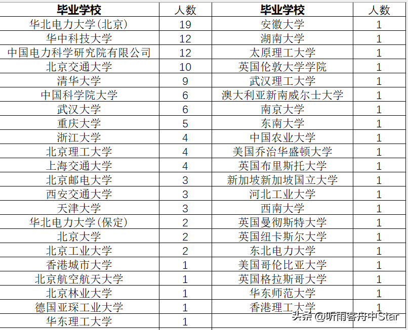 整体统计录用3人及以上的高校14所。第一位华北电力大学(北京)19人,华中科技大学、中国电力科学研究院有限公司各12人并列第二,第三位北京交通大学10人,第四位清华大学9人,中国科学院大学、武汉大学各6人并列第五。