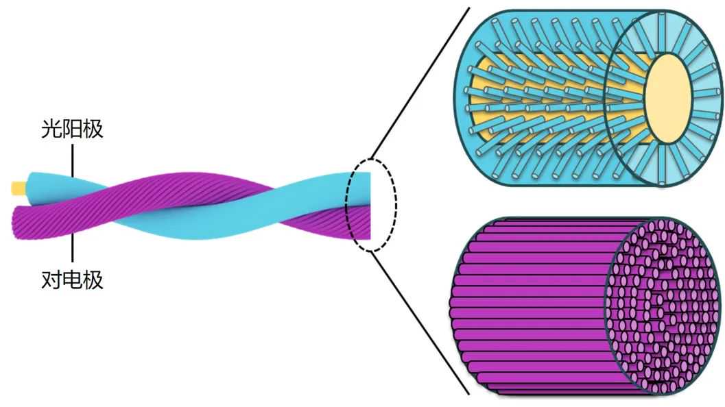 项目建立了新型纤维太阳能电池模型,在高曲率光阳极表面设计径向取向的金属氧化物纳米管阵列,揭示了径向取向纳米结构促进光生载流子高效收集的机制;将一维和二维导电纳米材料取向共组装创制出复合纤维对电极,发现了轴向取向纳米结构促进电荷快速传输的规律;通过螺旋加捻和同轴缠绕等方法创建稳定电极界面,构建出纤维染料敏化、聚合物、钙钛矿太阳能电池,实现了较高的光电转换效率,在反复弯折、扭曲、打结等复杂形变下保持稳定。通过材料模块化设计,实现了纤维太阳能电池与其他纤维器件的高效集成。研究成果有助于推动柔性太阳能电池的发展。