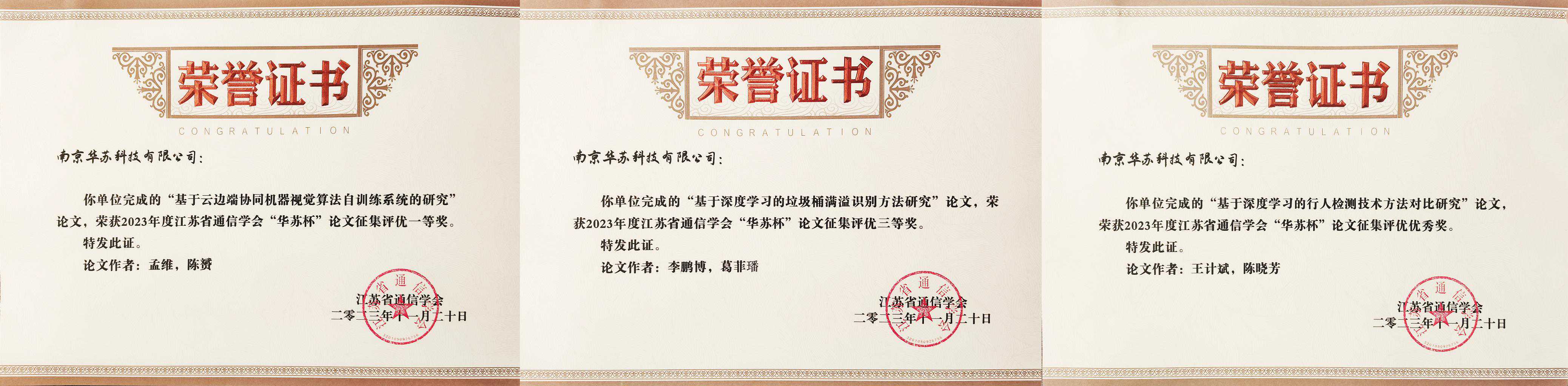 经江苏省通信行业科学技术奖专家的多轮评审,华苏科技论文《基于云边端协同机器视觉算法自训练系统的研究》荣获2023年江苏省通信学会“华苏杯”论文征集一等奖,《基于深度学习的垃圾桶满溢识别方法研究》荣获三等奖、《基于深度学习的行人检测技术方法对比研究》荣获优秀奖。