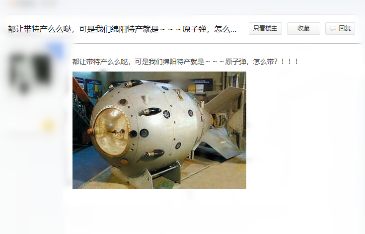 直到有人给出了这样一个答案:绵阳最知名特产:九院研制的原子弹!看到这个答案,一时间我竟无言以对也无法反驳!