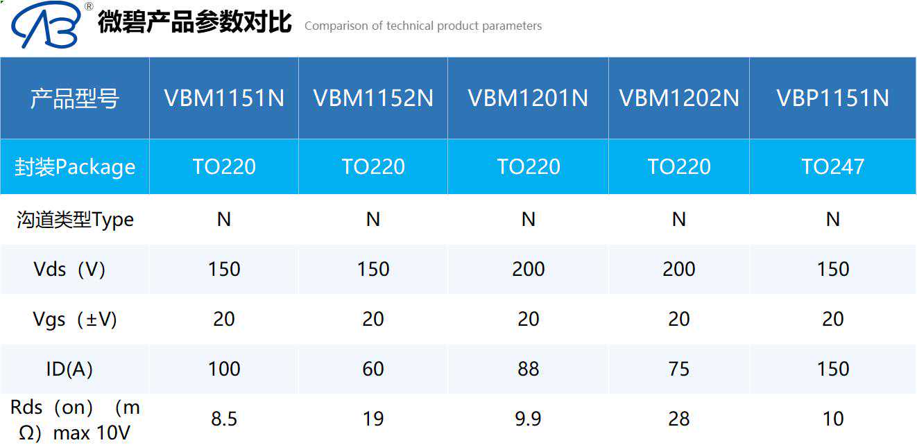 原系统中选用的是IRFB4115场效应管,也可以选用VBsemi微碧的VBM1151N,其Vds=150V,Id=100A,在本系统中可完美替代。