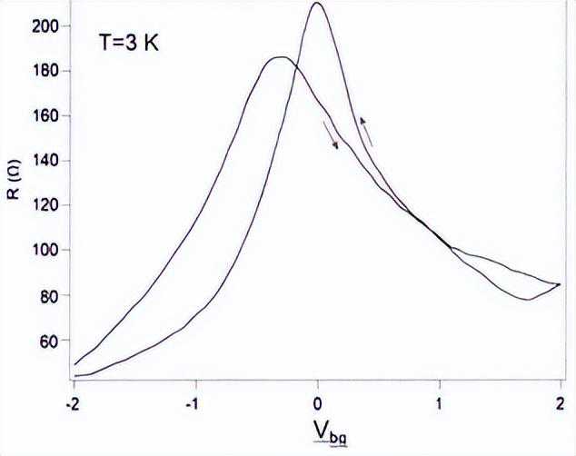 对于传统的h-BN夹持石墨烯电学器件的转移特性曲线,电阻的峰值应出现在门电压为零处,该峰值对应着单层石墨烯能带结构中的狄拉克(Dirac)点,门电压的调控实质上是对费米面的调节。