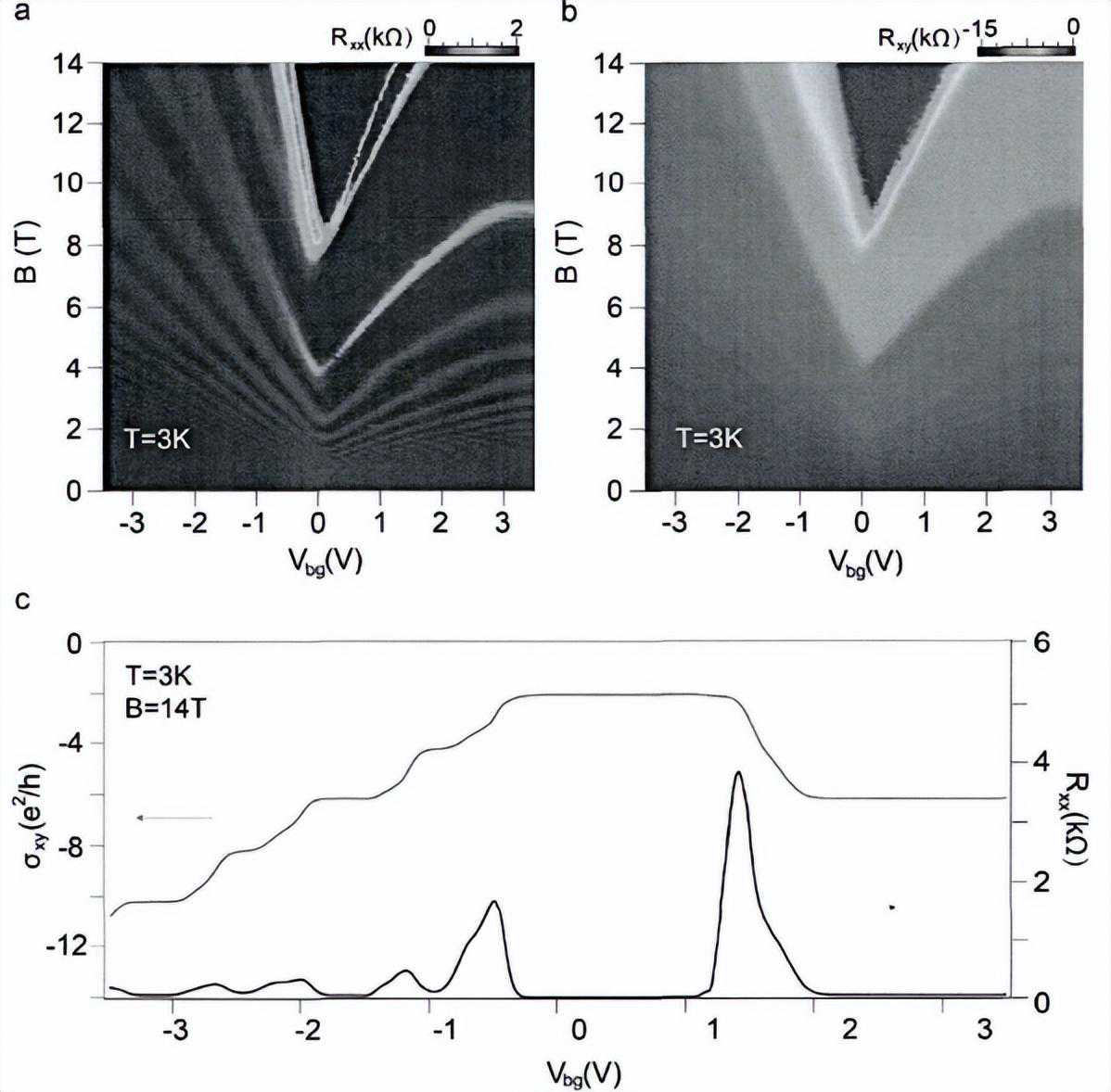 石墨烯出现了偶数量子霍尔效应,量子填充系数为v=-2、-4、-6、-8、-10,有趣的是,xy方向上的霍尔电导始终为空穴类型,即在整个栅压范围内皆为负数量子填充。