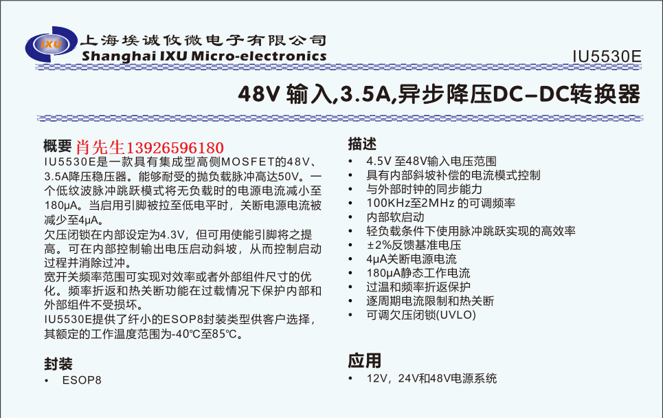 IU5530支持48V输入,输出12V-24V,3.5A异步降压DC-DC转换器