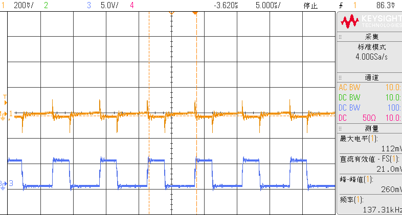 实际测量的C1纹波电压如下图通道1,是用交流挡位测试的,峰峰值是260mv,比理论计算的要大一些,但是注意理论计算的只是MOS开的过冲,MOS关断也会对电容的电压造成变化从而影响电压纹波,所有电容电压的纹波是开关频率的2倍,通道3是MOS的驱动波形,可以看出C1电容电压纹波的频率是开关频率的2倍