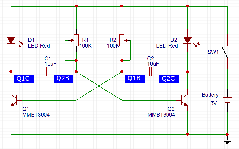 之后,三极管Q1和Q2会轮流导通和截止,产生持续震荡,令两个LED灯不断闪烁。