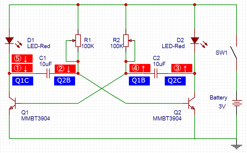 ①Q1C点的电压下降=②Q2B点的电压下降(导致了Q2的截止)=③Q2C点的电压上升(导致了LED灯D2的熄灭)=④Q1B点的电压上升=⑤进一步使Q1C点的电压下降(导致了LED灯D1的亮起)