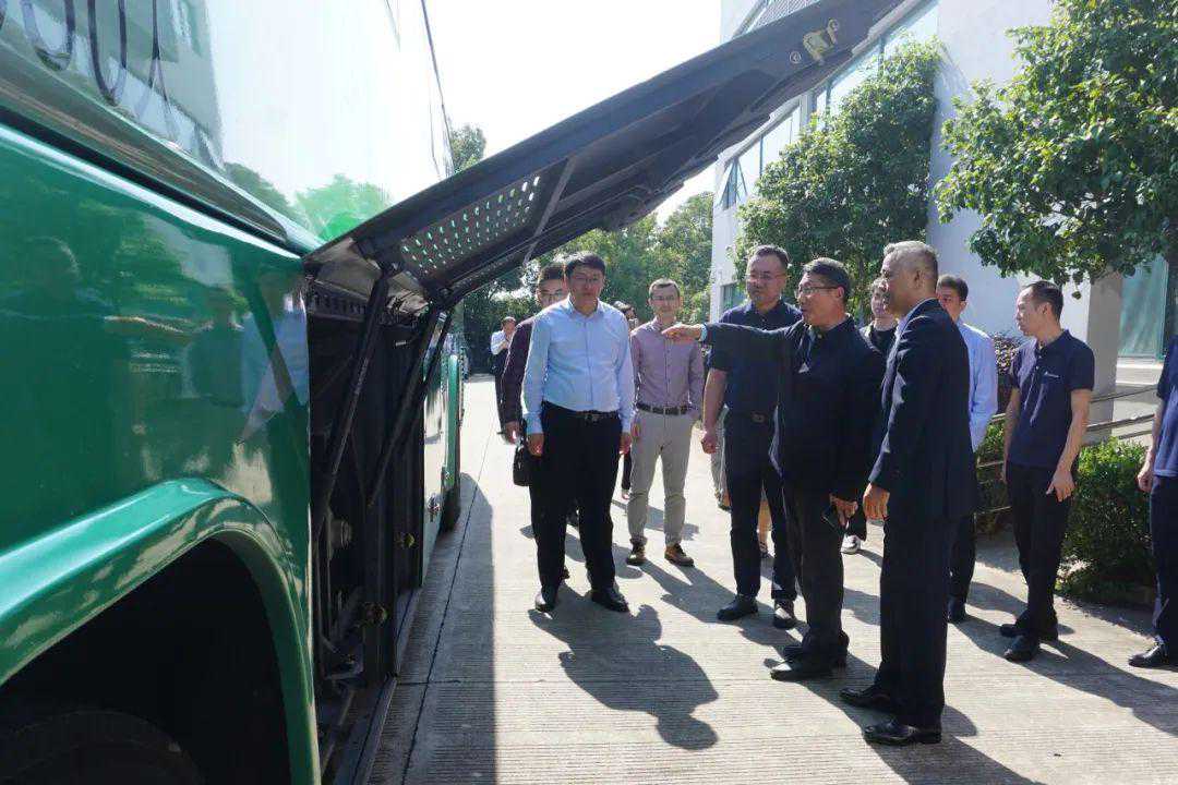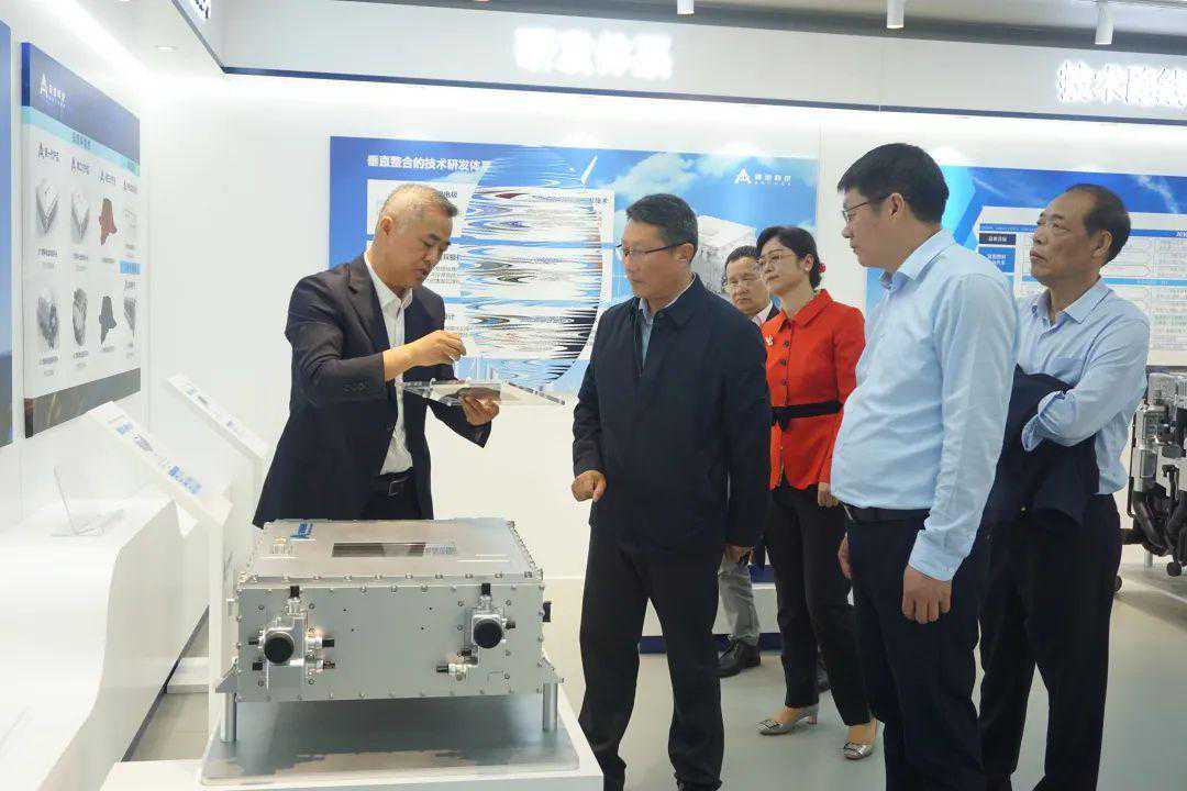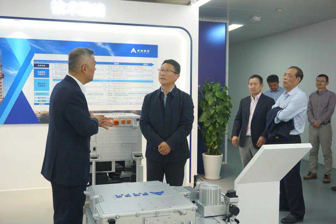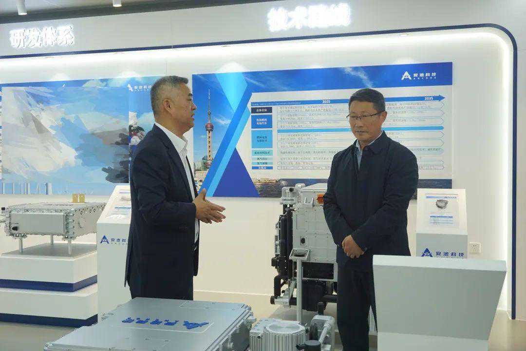 公司董事长梁铁强携各业务板块负责人陪同各位领导先后参观了搭载安池科技氢燃料电池的青浦工业园区通勤班车、公司展厅、性能检测实验室、集成测试车间、燃料电池系统产线、金属双极板涂层线及清洗线等产线装备。