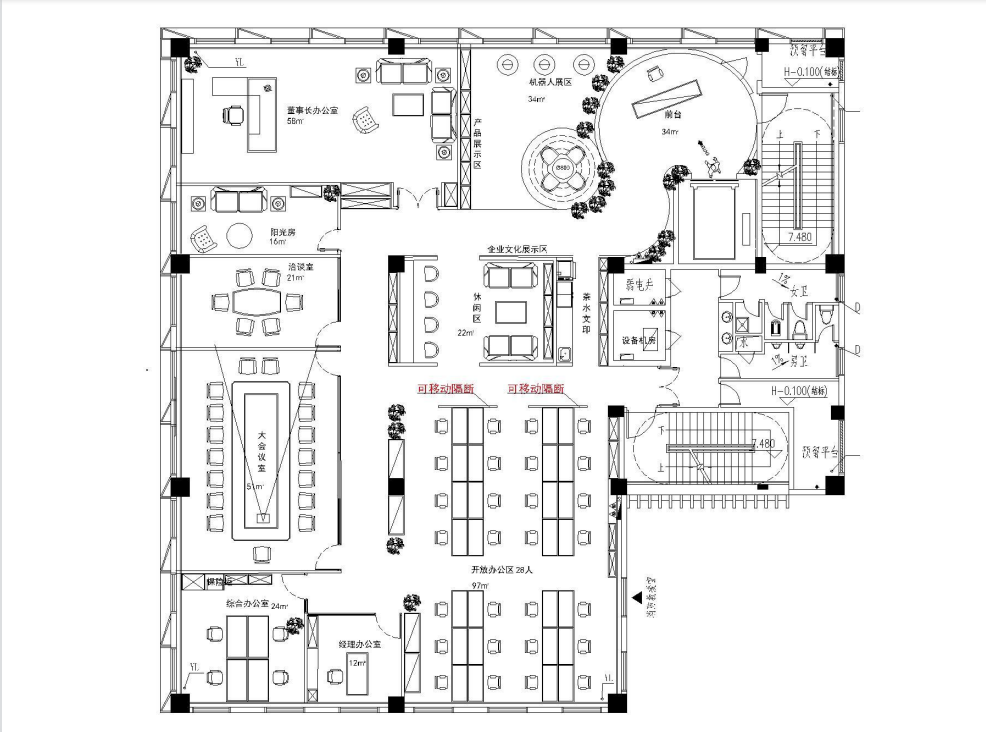笔者团队经过细致的分析后最终决定用高级灰和不同颜色的组合来进行此次项目设计主题,我们把前厅和展厅进行融合,通过有限的空间打造出流畅的动线安排,笔者团队经过分析发现企业多数来访客户基本都是董事长接待,因此我们把董事长的位置放置靠近展厅和前台的位置,为了实现职工和董事长动线路线的分流,我们通过打造开放式接待区,茶水文印区来实现职工动线上面的路线分流。有限的空间中我们给董事长旁边预留了一个阳光房茶室,既可以作为单独空间使用,又可以作为茶室等待室使用,实现空间区域利用的最大化。