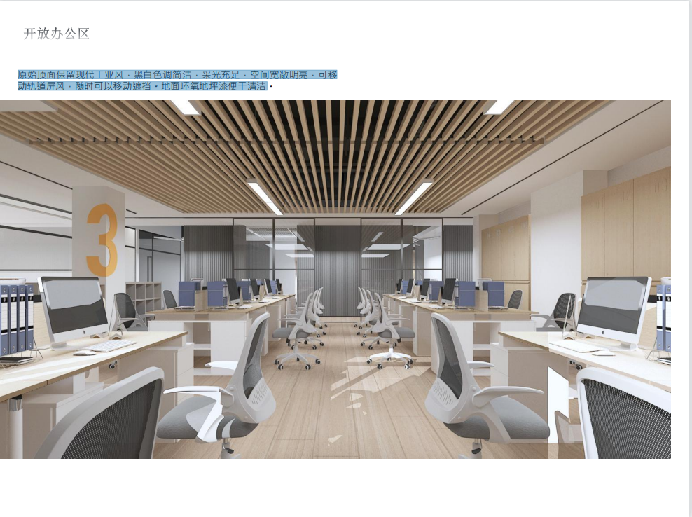 开放式办公区:原始顶面保留现代工业风,黑白色调简洁,采光充足,空间宽敞明亮,可移动轨道屏风,随时可以移动遮挡。地面环氧地坪漆便于清洁。