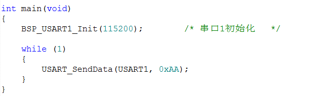 代码很简单,就是使用串口不断地往外发数据0xAA(当然发送其它数据也是可以的)。我们的串口配置如下: