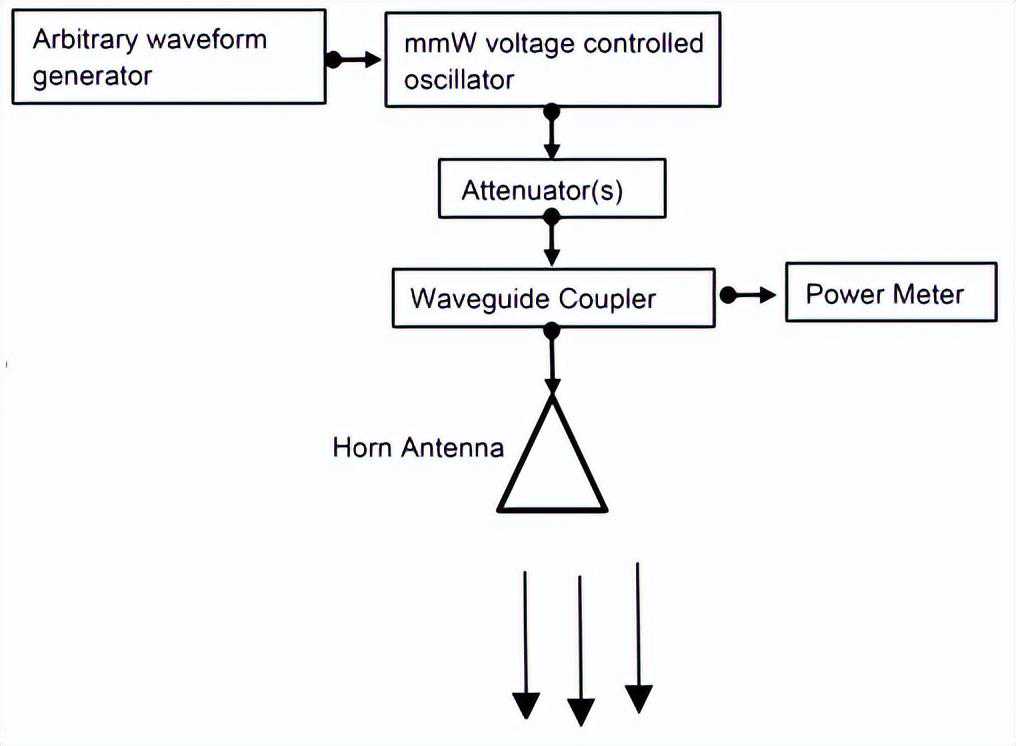 AIT模拟器系统可以产生模拟实际毫米波AIT扫描仪的强度和脉冲特性的曝光场。该模拟器系统由图7和表2中所示的组件组成。模拟器系统使用一个电压控制的毫米波振荡器(从约20-30GHz扫描)和任意波形发生器产生大约100kHz的方波调制的毫米波载波信号。毫米波信号被馈送到一个发射喇叭天线,以复制L3安全系统天线的辐射。