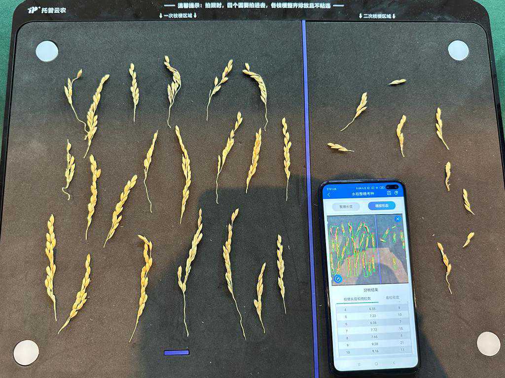 种业发展同样离不开农业现代化。将水稻枝梗排列好,用手机对准拍照,几秒钟后,各枝梗长度、穗粒数、着粒密度等指标清晰显示。除此之外,这款“水稻整穗考种测量系统”采用先进的图像处理技术,同样为水稻形态学的研究提供了良好的检测工具。