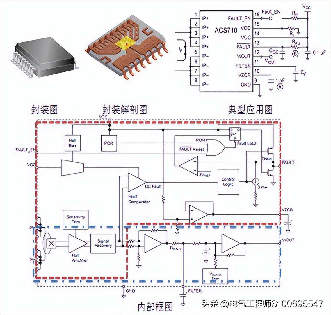 与ACS712相比,ACS710多了一个过流保护功能。如上图所示,蓝色虚框为ACS710的电流检测回路,红色虚框为ACS710的过流保护回路。