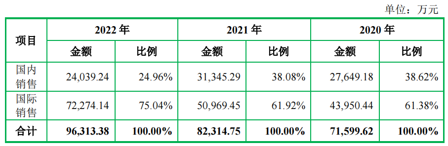 报告期内,森峰科技国内销售收入占当期主营业务收入的比例分别为38.62%、38.08%和24.96%,呈下降趋势;公司国际销售收入及占比逐年提高。报告期内,公司产品出口目的地覆盖全球一百余个国家和地区,公司国际收入占同期主营业务收入的比例分别为61.38%、61.92%和75.04%,占比较高。