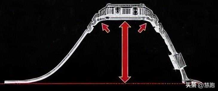 手表与表带的连接处呈弯曲状固定,表带成为一个缓解冲击的构件,当手表遇到正面冲击时,它可以缓解大部分撞击力,把手表反弹回来。
