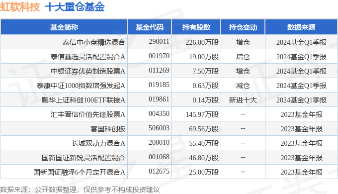 持有虹软科技最多的基金为泰信中小盘精选混合,目前规模为7.68亿元,最新净值2.063(4月19日),较上一交易日下跌2.41%,近一年下跌40.33%。该基金现任基金经理为董季周。