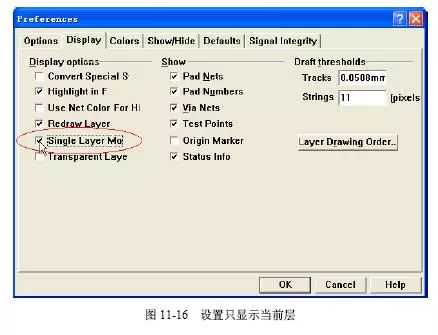 在绘制内电层边框时,用户一般将其他层面的信息隐藏起来,只显示当前所编辑的内电层,方便进行边框的绘制。选择【Tools】/【Preferences…】命令,弹出如图11-16所示的对话框。选择Display选项,再选择SingleLayerMode复选框,如图11-16所示。这样,除了当前工作层Power之外,其余层都被隐藏起来了,显示效果如图11-17所示。